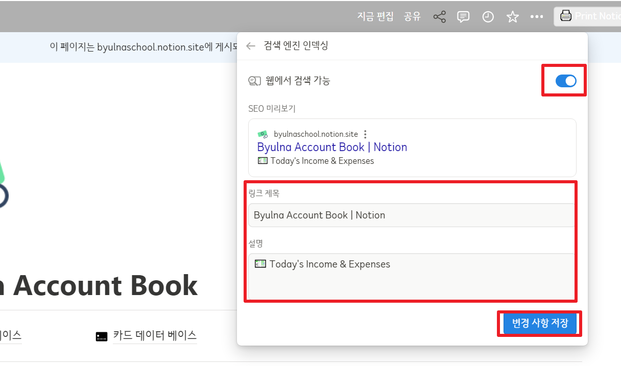 원래 공유 기능의 템플릿 복제 하단에 있었던 메뉴였지만 기능이 추가되어 단독 기능으로 적용되었습니다. 현재 플러스 이상 요금제를 사용하고 있어서 링크 제목과 설명을 편집할 수 있지만 무료 사용자의 경우 SEO 미리보기 기능만 제공됩니다. 링크 제목과 설명은 메타 디스크립션이라고 생각하고 적용하면 되겠습니다.
