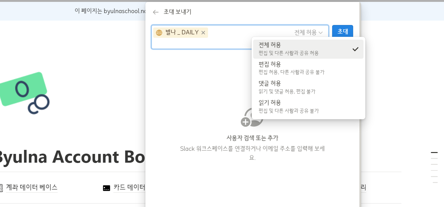 이메일을 등록하면 하단 이미지 처럼 보이고 권한을 설정하고 초대를 클릭합니다.