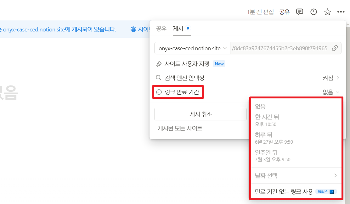유료 사용자라면 링크 만료기간을 원하는 날짜를 선택해서 선택 후 URL을 제공할 수 있습니다. 마감기간이 있는 페이지라면 이 기능을 통해 불편함을 해소할 수 있습니다.