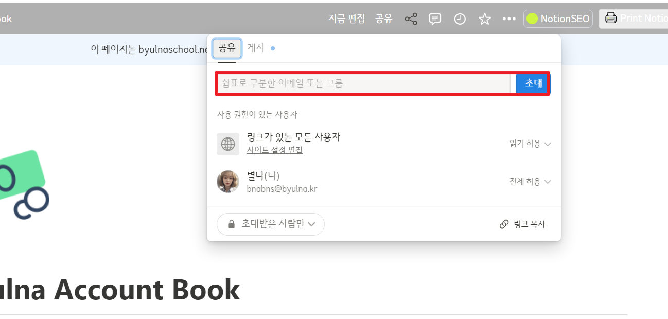 노션 페이지를 링크가 있는 모든 사용자가 볼 수 있도록 열어둘 수도 있지만 초대한 사람만 볼 수 있게 초대기능을 활용할 수도 있습니다.