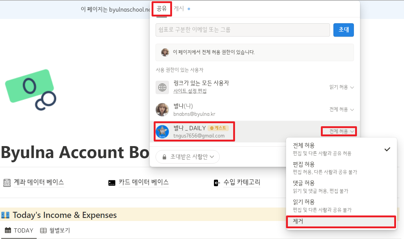 참고로 무료 사용자의 경우 게스트 초대는 10명까지 가능하니 많은 분들과 협업을 진행하는 경우가 아니라면 비용의 부담이 없으니 노션 얼마든지 자유롭게 사용할 수 있습니다. 게스트로 초대한 사용자의 권한을 변경하거나 제거하고자 한다면 공유 메뉴의 사용자 메뉴를 통해 진행하도록 합니다.