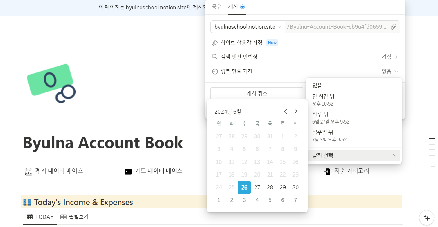 링크 만료 기간 선택은 유료 사용자만 사용할 수 있습니다. 링크 만료 기간은 페이지 링크를 제공하고 열람, 템플릿 복제 등의 기능을 기간에 한해서 제공하겠다는 기능입니다.