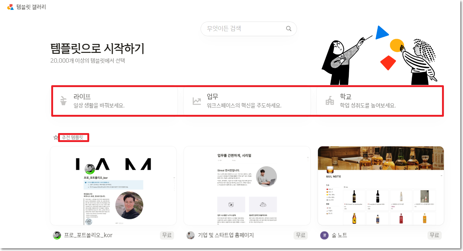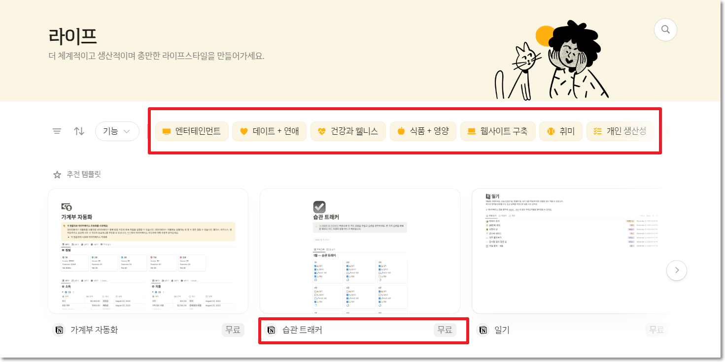 필요한 템플릿이 무엇인지 주제별로 찾아본 후 선택합니다. "라이프" 카테고리에는 다양한 주제의 템플릿을 확인할 수 있습니다.