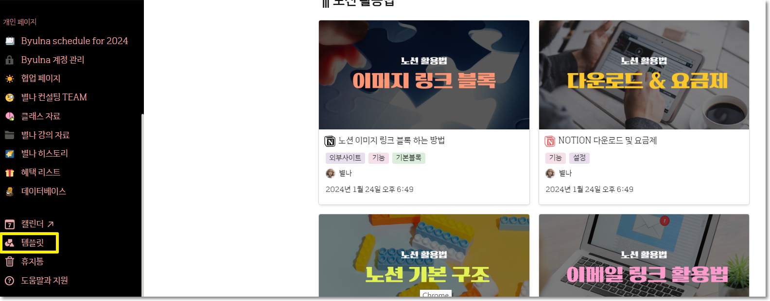 노션에서 제공되는 템플릿의 종류는 많습니다. 왼쪽 사이드바 메뉴 하단에 "템플릿" 메뉴를 클릭하여 사용할 수 있습니다.