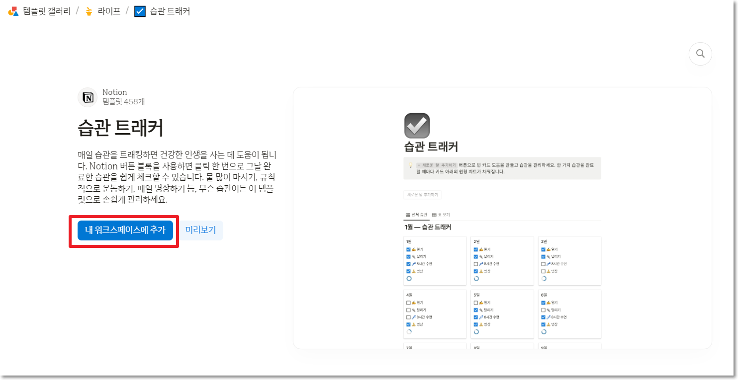 템플릿을 선택 후 내 워크스페이스에 추가를 누르면 페이지를 선택할 수 있습니다. 노션에서 제공되는 템플릿으로 시작하기 위해서 개인 페이지를 선택합니다. 페이지에 있는 습관 트래커 템플릿을 원하는 대로 수정 또는 추가하여 사용할 수 있습니다. 전체 페이지로 생성되는 데이터베이스의 경우 데이터베이스 안의 속성 추가 및 변경은 가능하지만 다른 블록은 추가할 수 없으니 참고하시기 바랍니다.