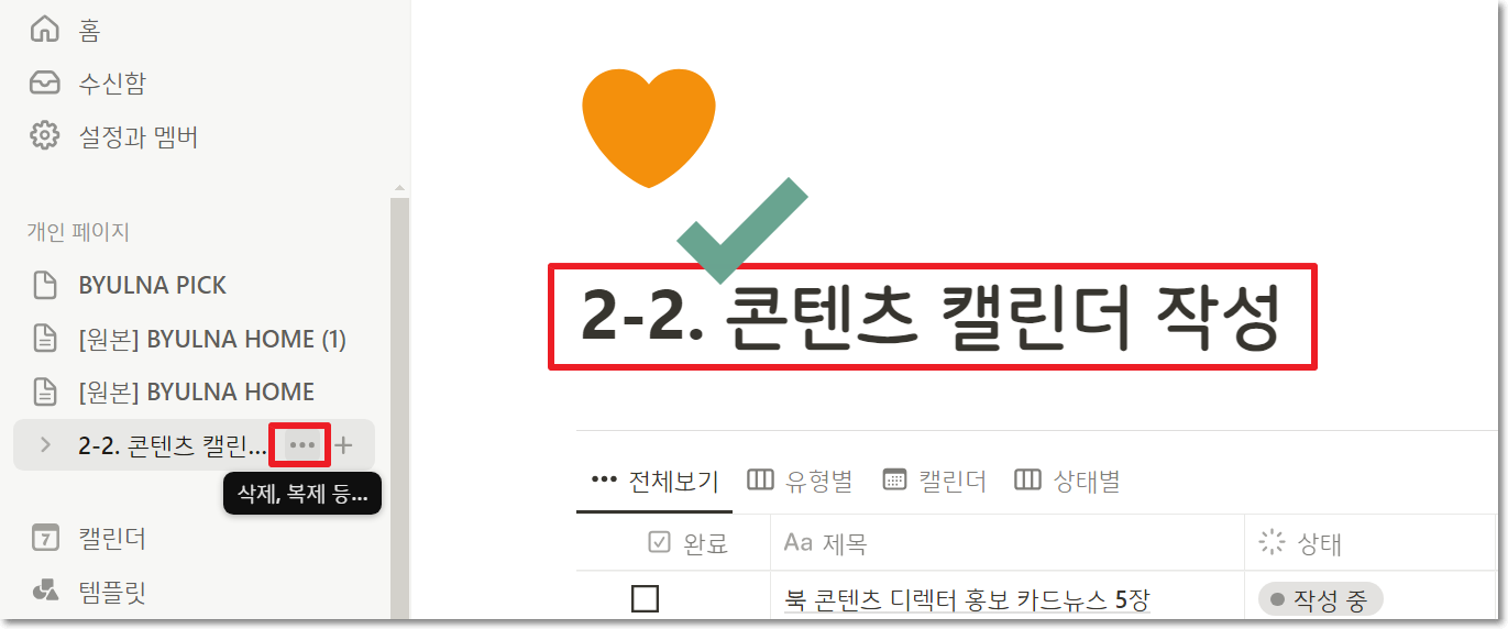 템플릿을 복제했다면 되도록 복제 후 수정해서 사용하는 것을 권장합니다. 제공받은 템플릿을 원본으로 보관해야 추후 잘못되었을 때 다시 복제해서 사용할 수 있으니 참고하세요. 페이지 옆에 마우스를 가져가면 점 세 개를 볼 수 있으니 클릭합니다.
