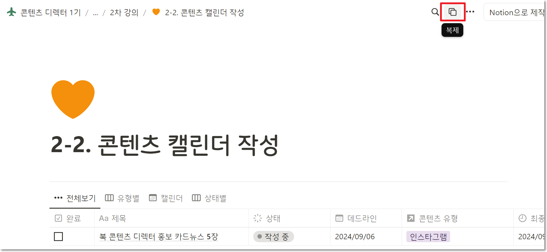 제공받은 링크를 클릭하거나 사용하고 있는 브라우저에 노션 로그인 후 새 탭을 열어 붙여넣기 하여 열어보면 하단의 이미지처럼 보입니다. 노션 화면의 우측 상단에 복제 아이콘을 클릭하면 됩니다.