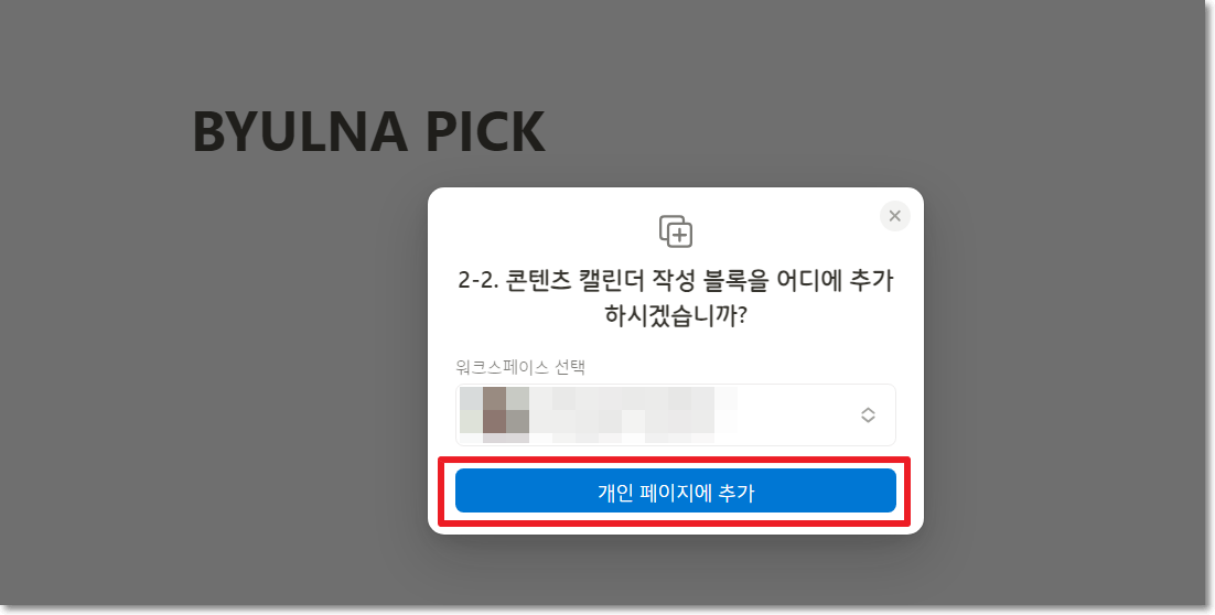템플릿을 선택 후 내 워크스페이스에 추가를 누르면 페이지를 선택할 수 있습니다. 노션에서 제공되는 템플릿으로 시작하기 위해서 개인 페이지를 선택합니다. 페이지에 있는 습관 트래커 템플릿을 원하는 대로 수정 또는 추가하여 사용할 수 있습니다. 전체 페이지로 생성되는 데이터베이스의 경우 데이터베이스 안의 속성 추가 및 변경은 가능하지만 다른 블록은 추가할 수 없으니 참고하시기 바랍니다.