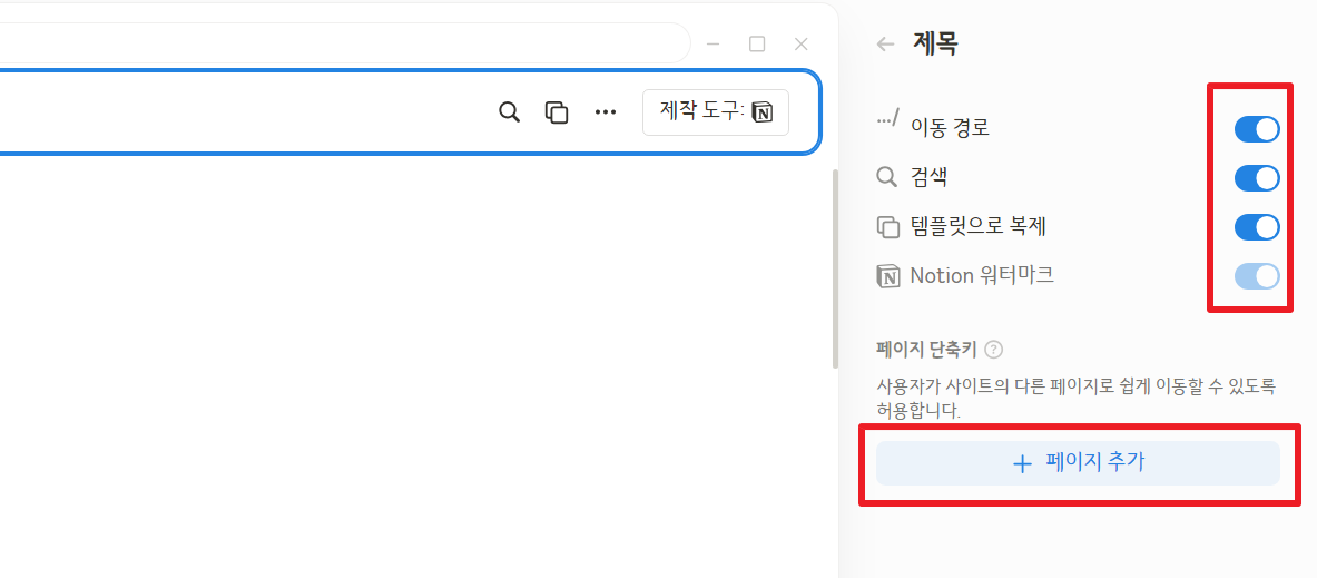 두 번재로 보이는 제목 메뉴에 우리가 찾던 템플릿 복제를 열고 닫을 수 있으며 페이지의 이동경로와 검색을 표시하거나 끌 수 있습니다. 워터마크의 경우 노션에서 제공하는 도메인이 아닌 사용자 지정 도메인을 사용할 경우 활성화 할 수 있습니다. 현재 페이지에 다른 페이지를 연결하여 빠르게 이동할 수 있게 하고 싶다면 페이지 추가를 진행할 수 있습니다. 다양한 기능이 많이 생겨서 노션 웹사이트를 사용하고자 하는 분들께 많은 도움이 될 것 같습니다. 모든 작업이 끝나면 변경 사항 게시를 적용합니다.
