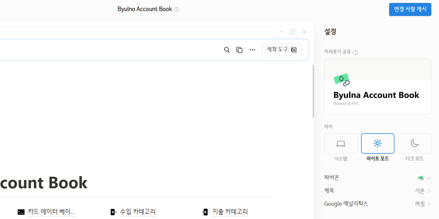 사이트 사용자 지정 메뉴는 새롭게 생긴 메뉴로 테마를 선택할 수 있고 파비콘, 제목, 구글 애널리틱스 활성화 부분을 적용할 수 있습니다. 파비콘은 페이지의 아이콘으로 280*280 픽섹 이미지로 업로드 후 변경할 수 있습니다. 변경하지 않을 경우 노션 페이지에 적용한 아이콘으로 적용됩니다.